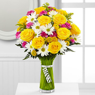 The Thanks Bouquet is a simply gorgeous way to send your gratitude and thanks to friends, family and loved ones near and far! Bright yellow roses are surrounded by white traditional daisies, hot pink mini carnations, yellow button poms and lush greens to create an impressive flower arrangement. Presented in a designer green glass vase with a silver metallic decorative tag stating, Thanks, dangling from the neck, this mixed flower bouquet is a wonderful gift to send as a thank you to any of the deserving people in your life.
