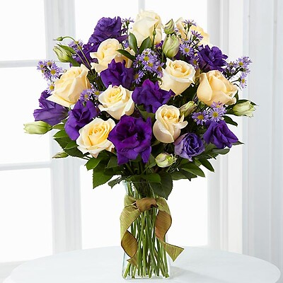The Angelique™ Bouquet blooms with sweet sophistication and gorgeous grace to create a special moment for your recipient. Cream roses are arranged to perfection against the royal purple hues of double lisianthus and monte casino asters perfectly accented with lush greens. Beautifully arranged as a Hand Tied Bouquet, or in a clear square tapered glass vase tied at the neck with an amber wired taffeta ribbon, these bouquets send your warmest sentiments with glamour and grace.