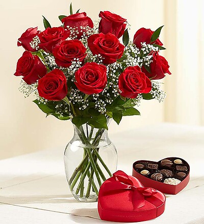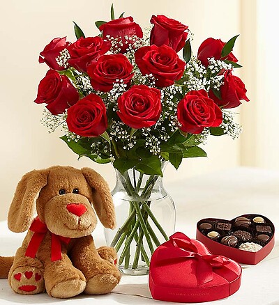 There’s no limit to the love you feel for your Valentine. Let her know with the ultimate romantic gesture! A dozen of our radiant long-stem red roses are available on their own or paired with our adorable plush puppy and a box of delectable Harry London® chocolates for an extra sweet surprise.